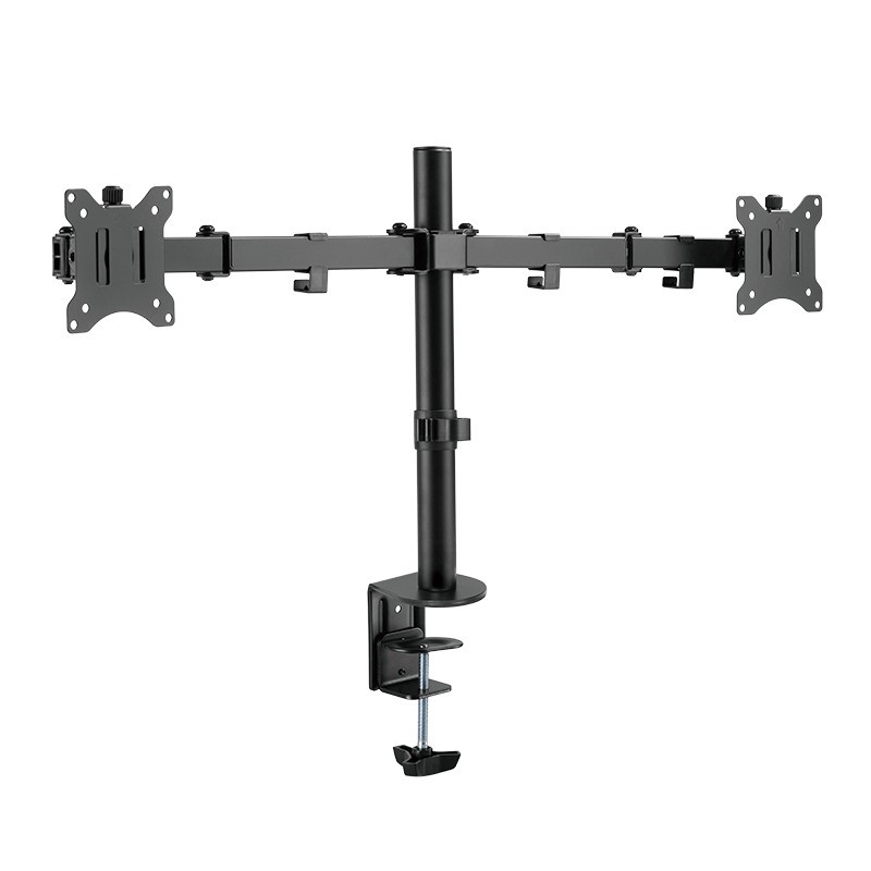 - Pogodno za monitore od 17–32 inča- Broj monitora: 2- Vrsta montaže: Montaža stegom za sto- Kapacitet težine: Svaka ruka 8 kg max- Maksimalna dužina ruke: Svaka 390 mm- Tilt: -45°/+45°; Okretanje: 180°; Prednji panel rotirajući: 360°- VESA: 75x75, 100x100- Visina nosača: 398 mm; Prečnik nosača: 35 mm- Slobodno podesiva visina: za optimalan ergonomski položaj- Upravljanje kablovima: Elegantno sakriva sve kablove povezane sa monitorom- Pribor za montažu uključen- Boja: crna