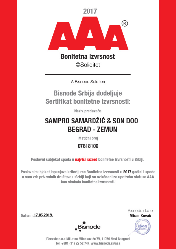 Sampro Samardžić & Son d.o.o. je jedini ovlašćeni Honeywell servis za Srbiju. Sampro Samardžić & Son d.o.o. poseduje Bisnode sertifikat bonitetne izvrsnosti. Sampro Samardžić & Son d.o.o. zvanični partner firme Edbak za Srbiju. Sampro Samardžić & Son d.o.o. distributer NoviSign IDS rešenja za Srbiju.